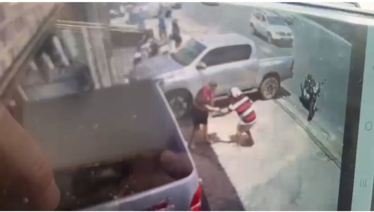 Pelas imagens do vídeo, o suspeito que estava em uma motocicleta, já desce do veículo com a arma em punho apontando em direação ao policial.