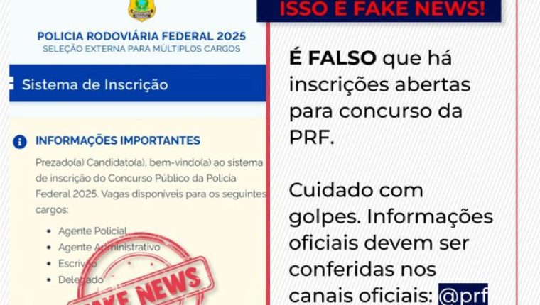 A Polícia Rodoviária Federal (PRF) emitiu um alerta nesta semana sobre uma fake news que está circulando nas redes sociais e aplicativos de mensagens. A notícia falsa afirma que há um novo concurso público da PRF com inscrições abertas.
