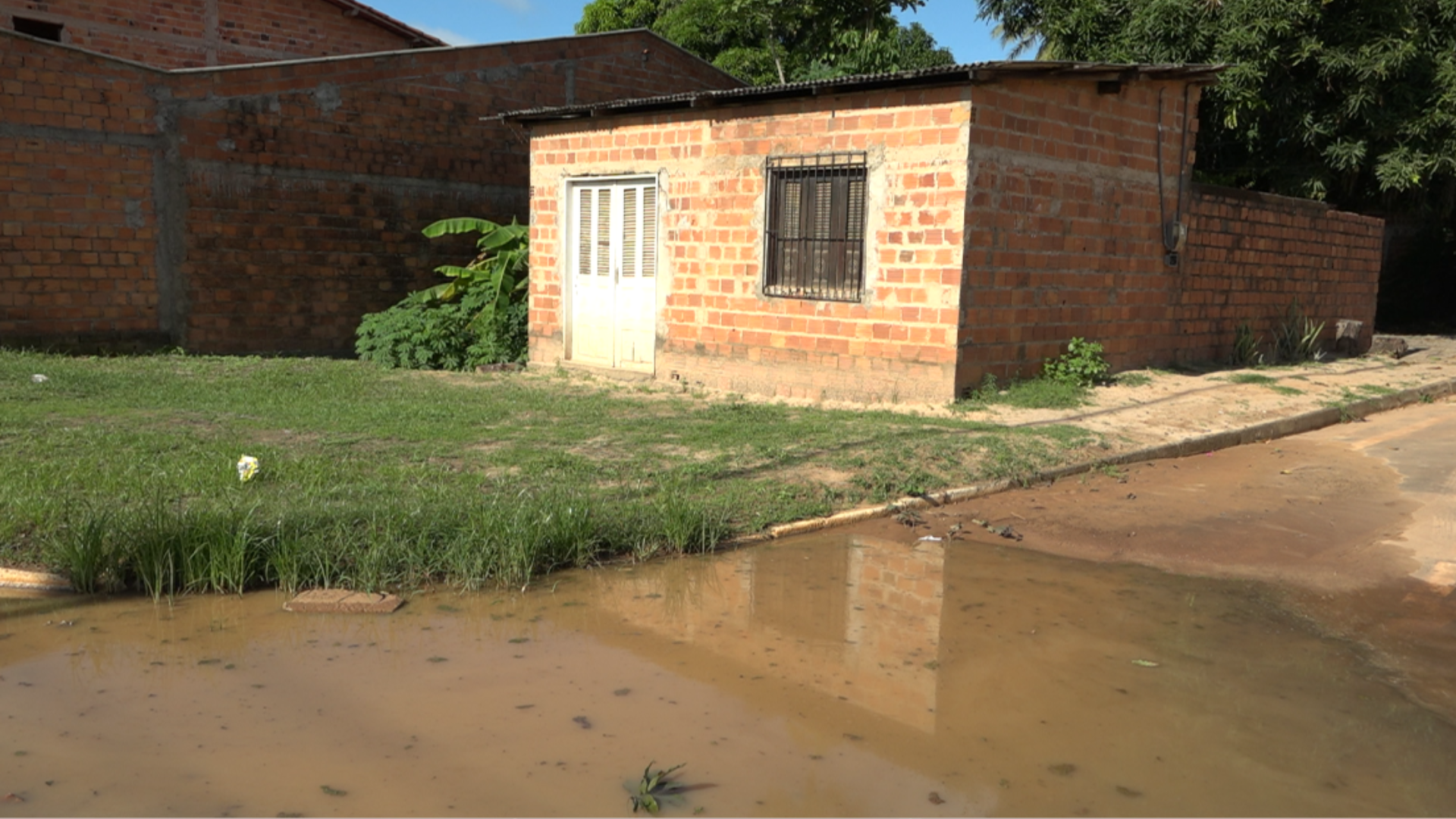 Durante o período chuvoso, a água invade as casas e fica acumulada na porta das residências. Mesmo sem chuvas fortes, é possível ver poças espalhadas ao longo da via.