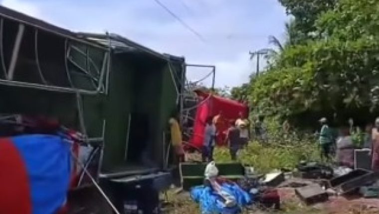 Um acidente envolvendo um trio elétrico, nesta sexta-feira (13), durante seu trajeto até o município de Itapecuru-Mirim na MA-014. Imagens gravadas por populares registraram o caminhão tombado próximo a rodovia.