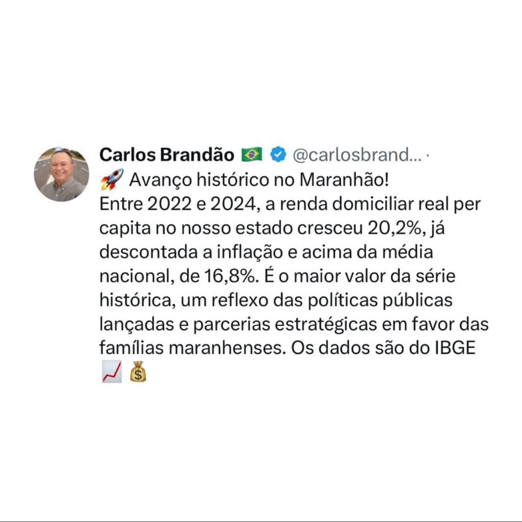Nas redes sociais, o governador Carlos Brandão destacou o resultado como reflexo das políticas públicas e parcerias em favor das famílias maranhenses.