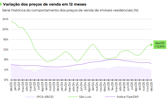 Além da presença no ranking dos bairros mais caros, São Luís também aparece entre as capitais com maior valorização anual dos imóveis em 2025, registrando alta de 13,91%. O preço médio do metro quadrado na capital maranhense chegou a R$ 8.617, superando capitais como Recife, Belém e Salvador.