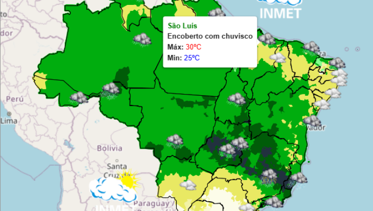 O Instituto Nacional de Meteorologia (Inmet) divulgou que há previsão de chuvas para São Luís, com a capital maranhense inserida em alerta amarelo de chuvas intensas, com perigo potencial.