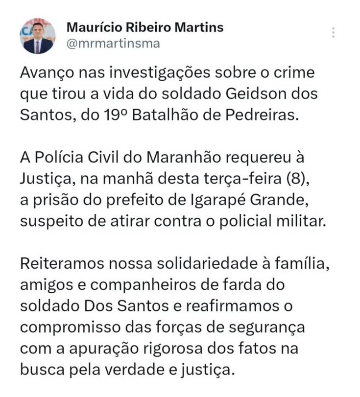 “A Polícia Civil do Maranhão requereu à Justiça, na manhã desta terça-feira (8), a prisão do prefeito de Igarapé Grande, suspeito de atirar contra o policial militar”, declarou o secretário, que também manifestou solidariedade à família da vítima e garantiu rigor na apuração do caso.