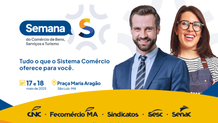 Nos dias 17 e 18 de maio, a Praça Maria Aragão, em São Luís, será palco da Semana S do Comércio, o maior evento integrado do Sistema Comércio no Brasil. Com realização da CNC, Fecomércio-MA, Sesc, Senac e Sindicatos Empresariais, a ação reunirá uma ampla programação gratuita voltada à promoção da cidadania, da qualificação profissional e do bem-estar da população maranhense.