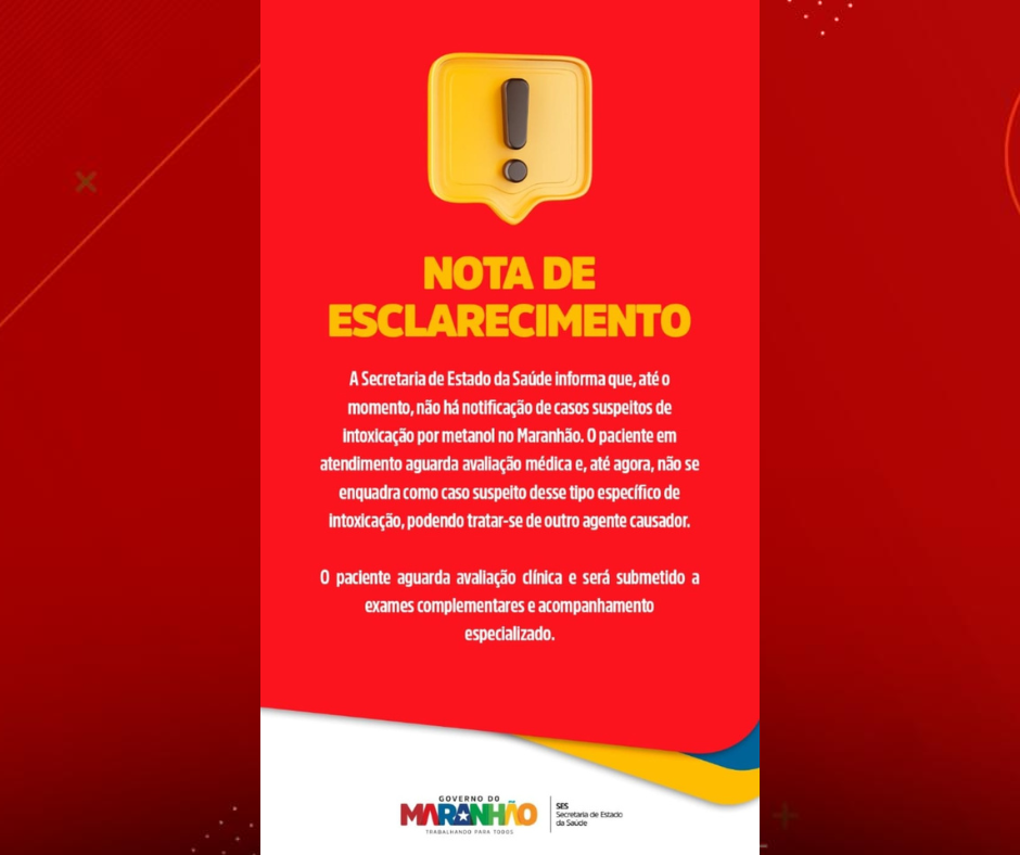 Após circular na internet que o Maranhão teria registrado seu primeiro caso de intoxicação por metanol nesta sexta-feira (10), a Secretaria de Estado da Saúde (SES) negou a informação, relatando que o caso poderia tratar-se de outro agente causador.