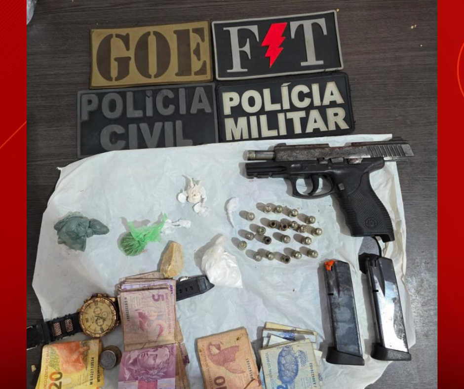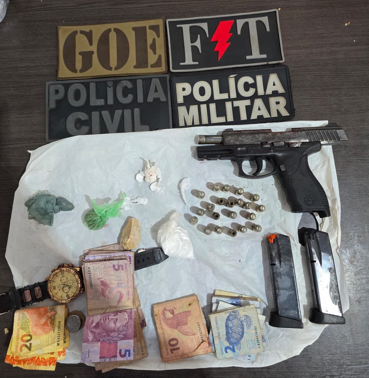 Os policiais conseguiram captura-lo e com o suspeito foi apreendido porções de crack e cocaína, uma pistola, munições calibre .40, carregadores e aparelhos celulares. Os materiais foram encaminhados para análise pericial.