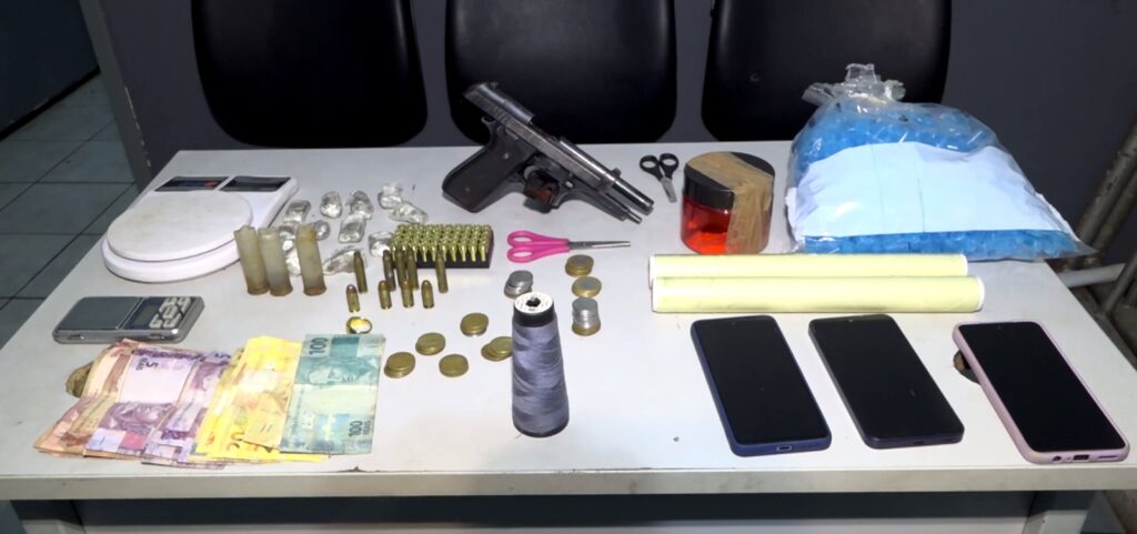 Além disso, também foram apreendidos celulares, mais de R$ 100 em espécie e uma pistola com várias munições. A partir de um brasão gravado no metal, os agentes constataram que a arma de fogo pertence à própria Polícia Militar e terá a origem específica investigada a fundo.