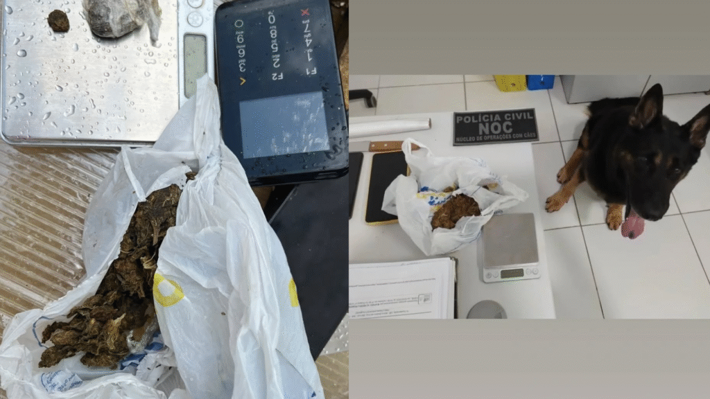Foram apreendidos maconha, balança de precisão, plástico filme, faca e uma máquina de cartão.