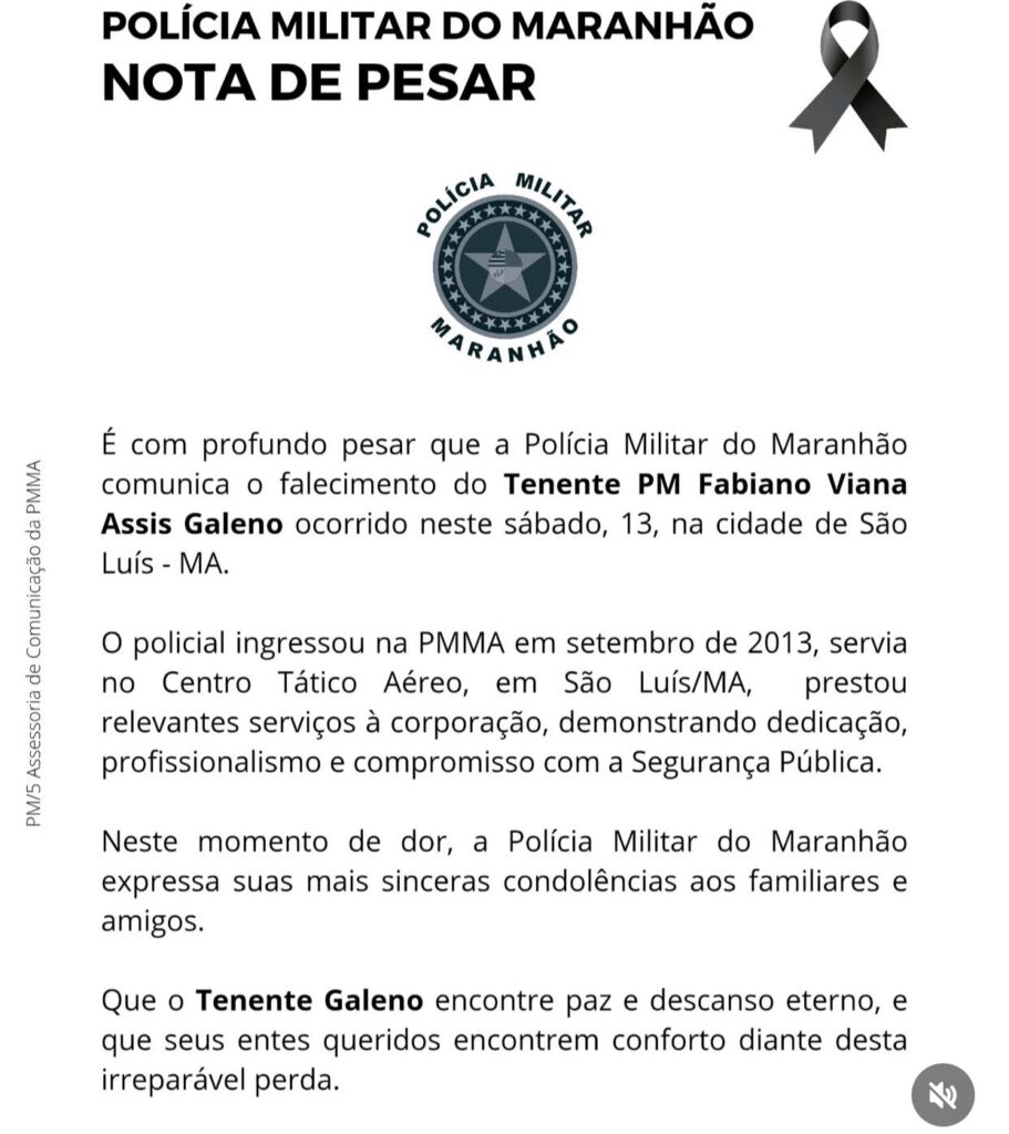 O 1º tenente Fabiano Assis Galeno morreu neste sábado (13), por volta das 9 horas da manhã, após sofrer um mal súbito e se afogar na piscina do condomínio onde morava, localizado no bairro Jaracati, em São Luís.
