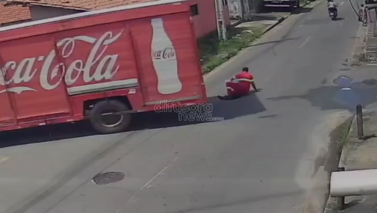 Câmeras de segurança registraram o momento em que um trabalhador ajudava o colega a manobrar um caminhão de entrega, quando caiu dentro de um bueiro que está sem tampa no meio da via.