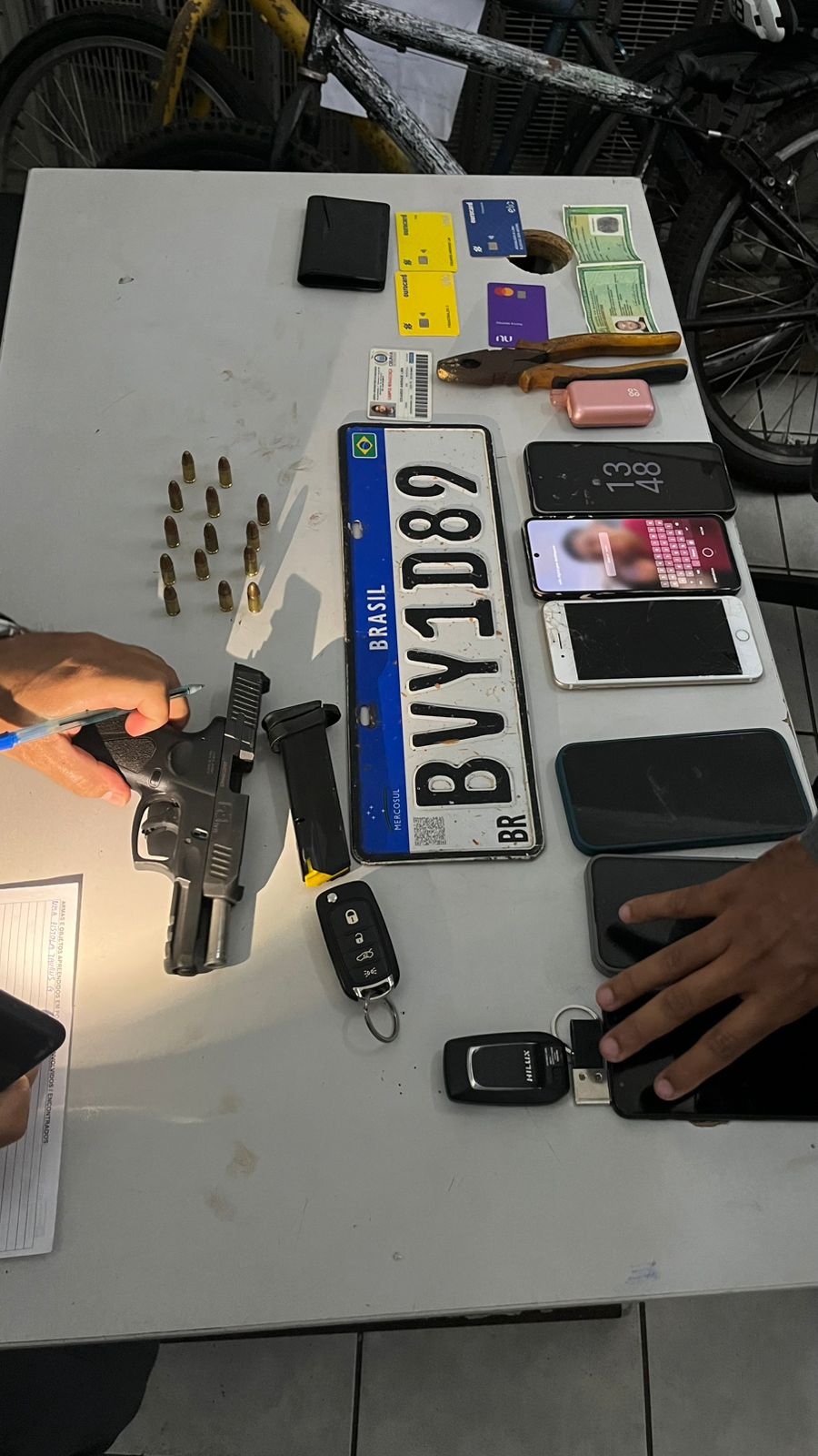 Durante a abordagem, policiais apreenderam uma pistola Taurus G3, calibre 9 milímetros, com 14 munições intactas, além de diversos aparelhos celulares, documentos pessoais, ferramentas e chaves veiculares. Também foi apreendido um veículo Fiat Argo prata, alugado, que estava com placa adulterada.