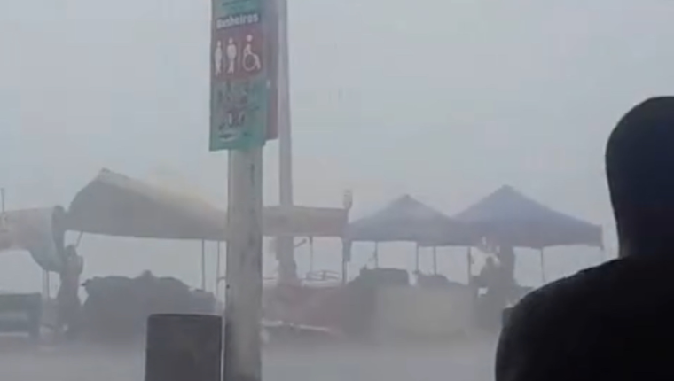Vídeos que circulam nas redes sociais mostram o momento em que tendas são arrastadas pela força do vento, gerando preocupação entre frequentadores da orla.