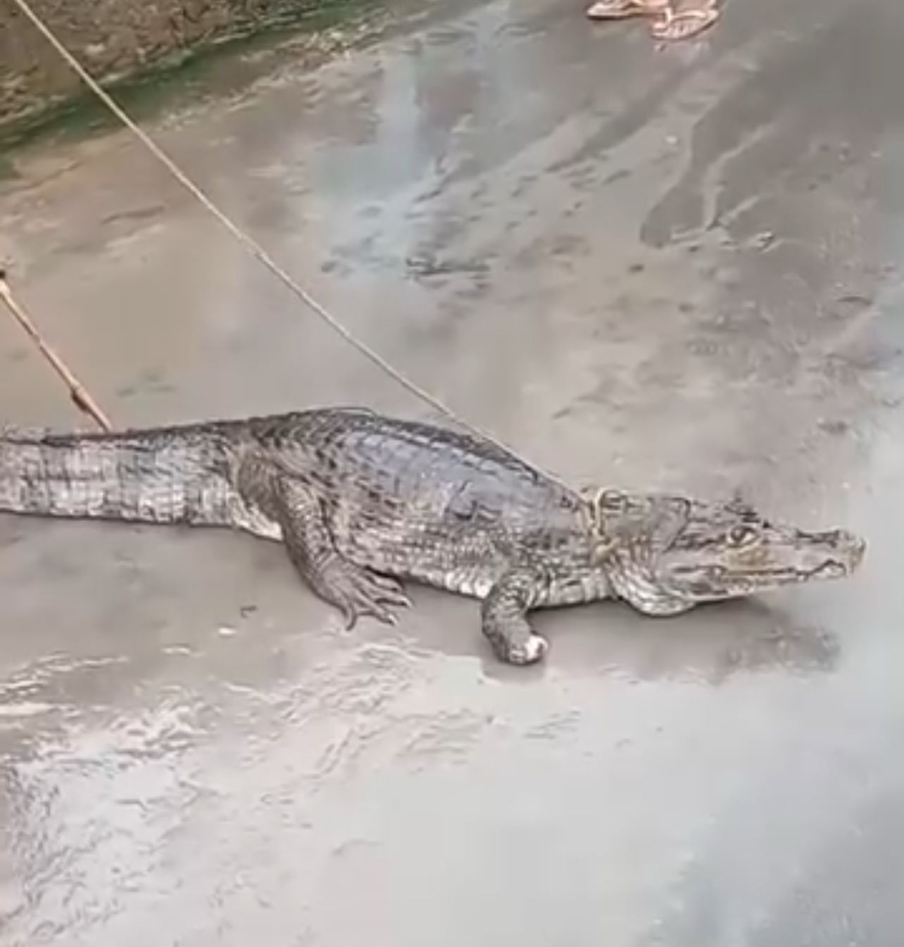 Imagens compartilhadas nas redes sociais mostram o animal amarrado com uma corda. Pelas imagens, é possível perceber que o jacaré está com a pata esquerda machucada.