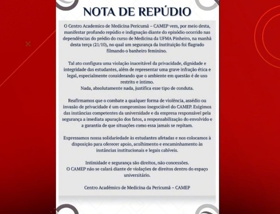 Em nota, a Universidade Federal do Maranhão-UFMA, através do Centro Acadêmico de Medicina Pericumã – CAMEP, manifestou profundo repúdio e indignação diante do episódio ocorrido nas dependências do prédio do curso de Medicina da UFMA Pinheiro.